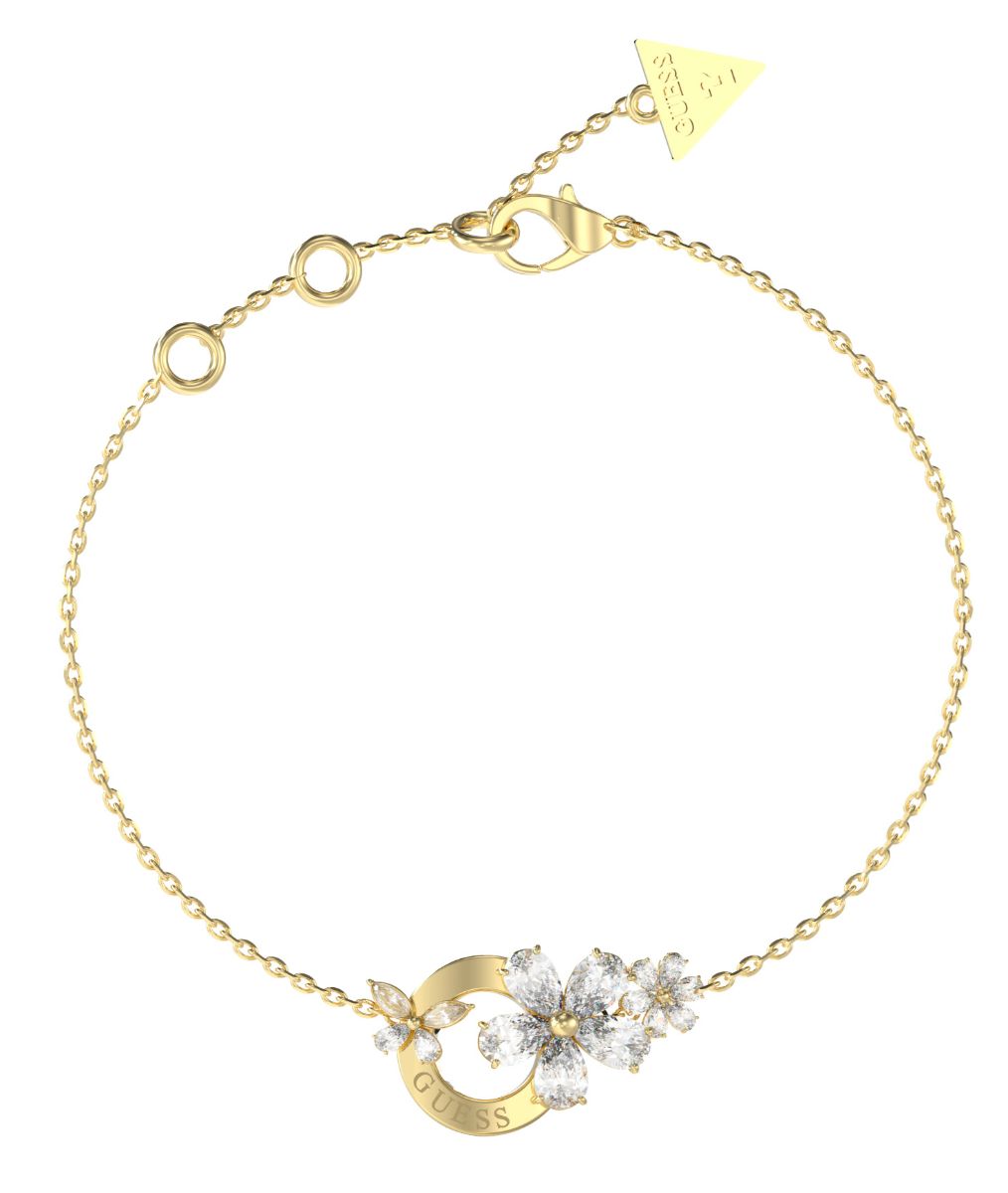 The flower petals of the gold-coloured GUESS Lily flower bracelet JUBB05106JWYGS are finished with clear droplet-shaped and navette-cut crystals for a delicate look. The flower necklace is made of stainless steel and comes in either S (14.6 + 18.4 cm) or L (17.2 - 21 cm), depending on your choice. You can choose the size that suits you from the drop-down menu. GUESS bracelets are delivered in the manufacturer's beautiful box.
