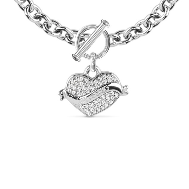 GUESS VINTAGE necklace exudes a retro style with a modern touch. Crafted from silver-tone stainless steel, the chain features a striking 20mm heart pendant embellished with sparkling crystal stones. The T-Bar clasp completes the look and makes the jewelry easy to use. Length 40.7 cm. The perfect choice for personal style.