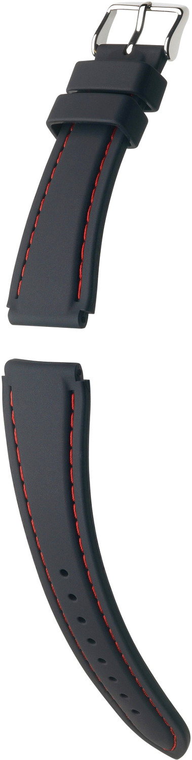 The Hirsch Belize watch strap 402 68 8 51 is made of black synthetic rubber and has red stitching. The watch strap is waterproof. The watch strap is available in 20 mm and 22 mm widths. The width is measured at the widest end of the watch strap, where it is attached to the watch case. The total length of the synthetic rubber parts of the watch strap is 19,5 cm. Hirsch watch straps are guaranteed for 1 year, covering manufacturing and material defects.