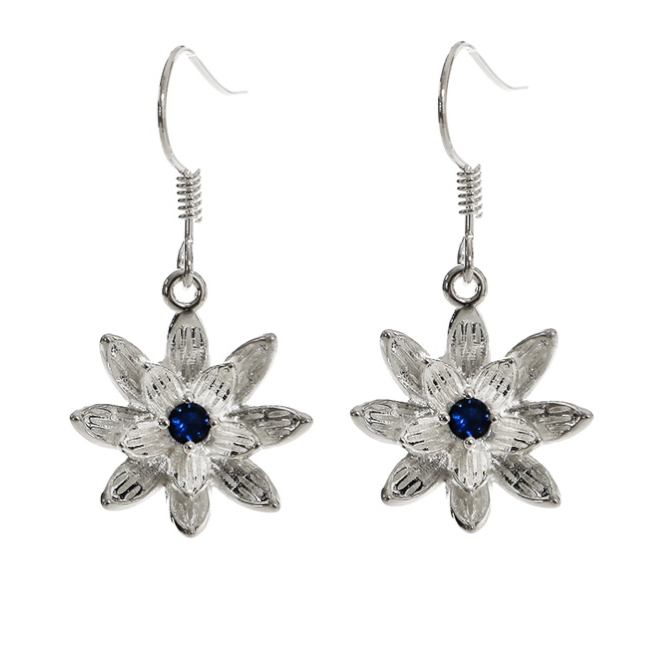 The Hopeapuro Dahlia is inspired by the beauty of nature. The Hopeapuro Dahlia earrings with blue small stone K426 are made of silver plated brass, and the flowers are surfaced with sapphire blue zirconia 3 mm in size. The diameter of the flower is 16 mm. The Dahlia earrings were designed in Finland, and are part of the Pure collection. It has been awarded the Design from Finland label.