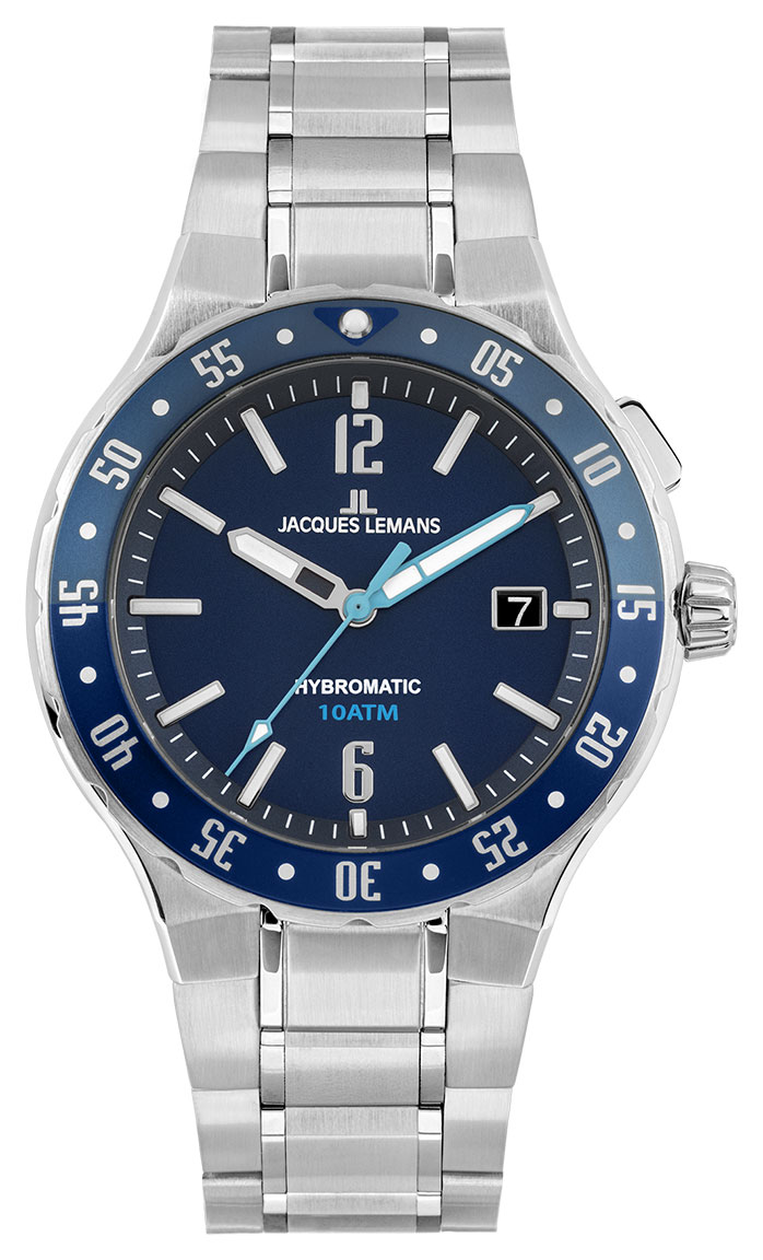 Jacques Lemans Hybromatic 1-2109H is a stylish men's wristwatch. The 40 mm wide case is made of silver-colored stainless steel. Beneath the mineral glass cover is a blue dial with the date at 3 o'clock. The bracelet is a silver-colored stainless steel bracelet. The Jacques Lemans 1-2109H is water resistant to 100m/10atm, making it swim proof. Jacques Lemans watches come with a 2-year warranty and are delivered in the manufacturer's original case.