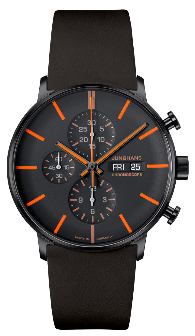 The striking features of the Junghans Form A Chronoscope 27/4370.03 chronograph watch are its shape and expressive colouring. The combination of deep black matte surfaces and polished surfaces creates an intriguing dynamic. The watch is inspired by British artist Richard Macneil's Time Square artwork in New York, which is a colour-matched print on the back glass of the case.