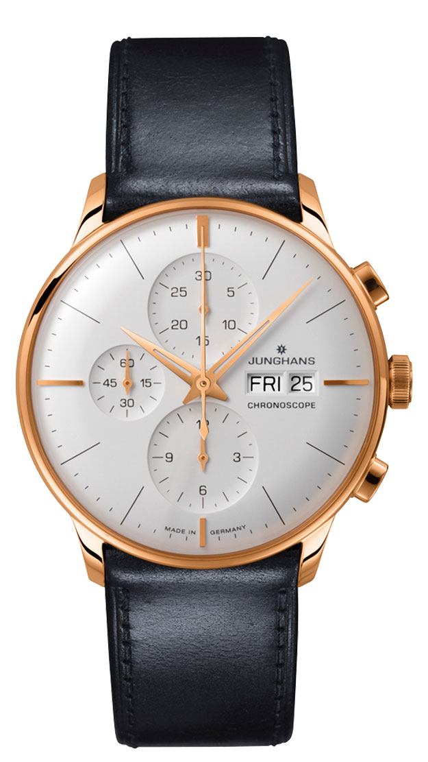 Junghans Meister Chronoscope 27/7023.03 is a stylish and dynamic chronograph watch with an automatic movement J880.1 calibre with a power reserve of up to 48 hours. The PVD-coated gold-coloured stainless steel case measures 40.7 mm in width and 13.9 mm in thickness. The white dial features sub-dials for chronograph functions, anti-scratch and anti-reflective sapphire glass, date and day-of-the-week display at 3 o'clock and luminescent minute and hour hands. Its black bracelet is made of genuine horsehide with a width of 21 mm at the attachment point. The Junghans Meister Chronoscope 27/7023.03 is water-resistant to 50m/5atm, meaning it has limited water resistance (swimming is not recommended).