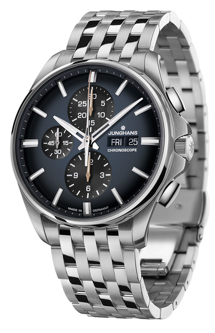 The Junghans Meister S Chronoscope 27/4228.45 watch features the J880.1 calibre automatic movement with a 48-hour power reserve (without the chronoscope function, which measures small time intervals accurately). The case is made of stainless steel with a width of 45 mm and a thickness of 15.9 mm. Durable sapphire glass with an anti-reflective coating protects the dark blue dial with 60-second, 30-minute and 12-hour counters, date and day-of-the-week displays and luminescent hands and indexes. The stainless steel bracelet is equipped with a fine adjustment function for easy adjustment of the bracelet length. The width of the bracelet is 22 mm at the attachment point. The Junghans Meister S Chronoscope 27/4228.45 is water resistant to 200m / 20atm, making it suitable for swimming and scuba diving.
