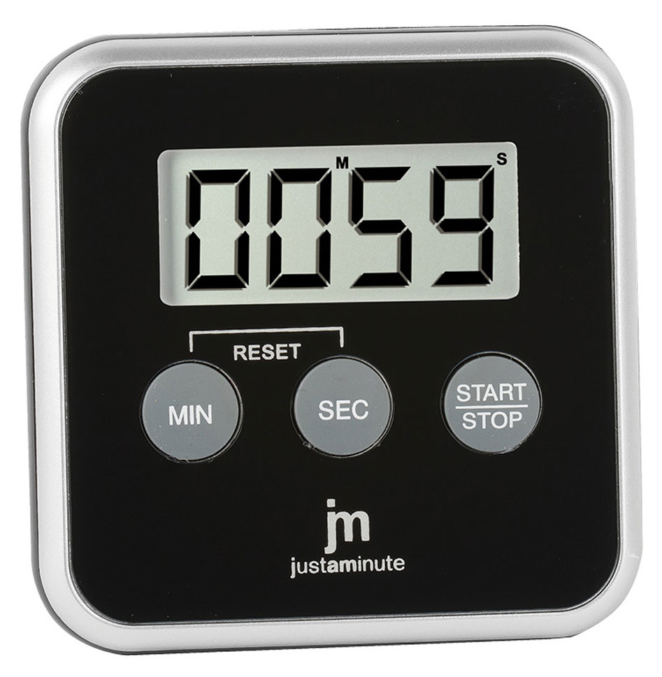 Justaminute JT5412N is a stylish digital timer measuring 8 x 8 x 1.5 cm. It has a black plastic frame and a digital dial. Features include: timer and chronograph. The timer can be hung on the wall, placed on a stand or attached with a magnet to a refrigerator, for example. The timer runs on one AAA battery (battery not included). Justaminute clocks have a one-year warranty.