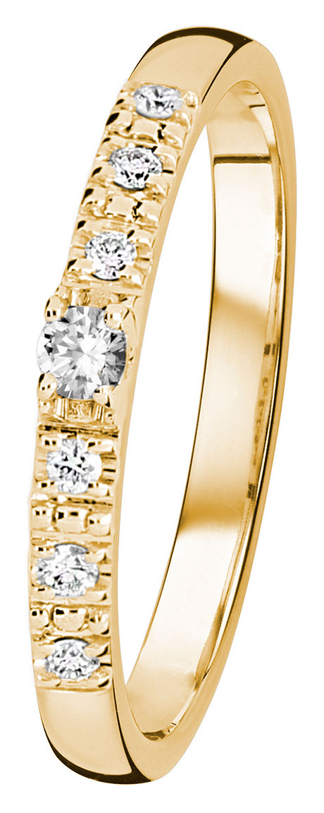 The Kohinoor 033-226-10 is a stunning Estelle diamond side-stone ring with seven clear diamonds. The material of the ring is 14 karat yellow gold. The body width is 2.1 mm. Design by Assi Arnimaa. < / p>