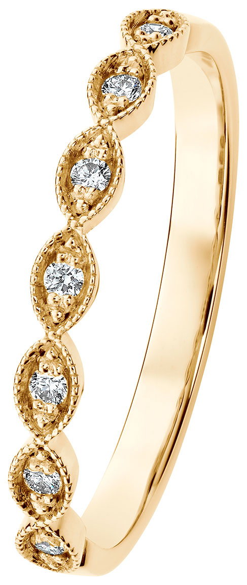 The Kohinoor 033-269-07 Clara diamond anniversary ring is made out of 14 karat yellow gold. The vintage-inspired anniversary band is planted with 7 diamonds and the edges of the ring are decorated with chrysanthemic, scalloped edges. Design by Sami Laatikainen.