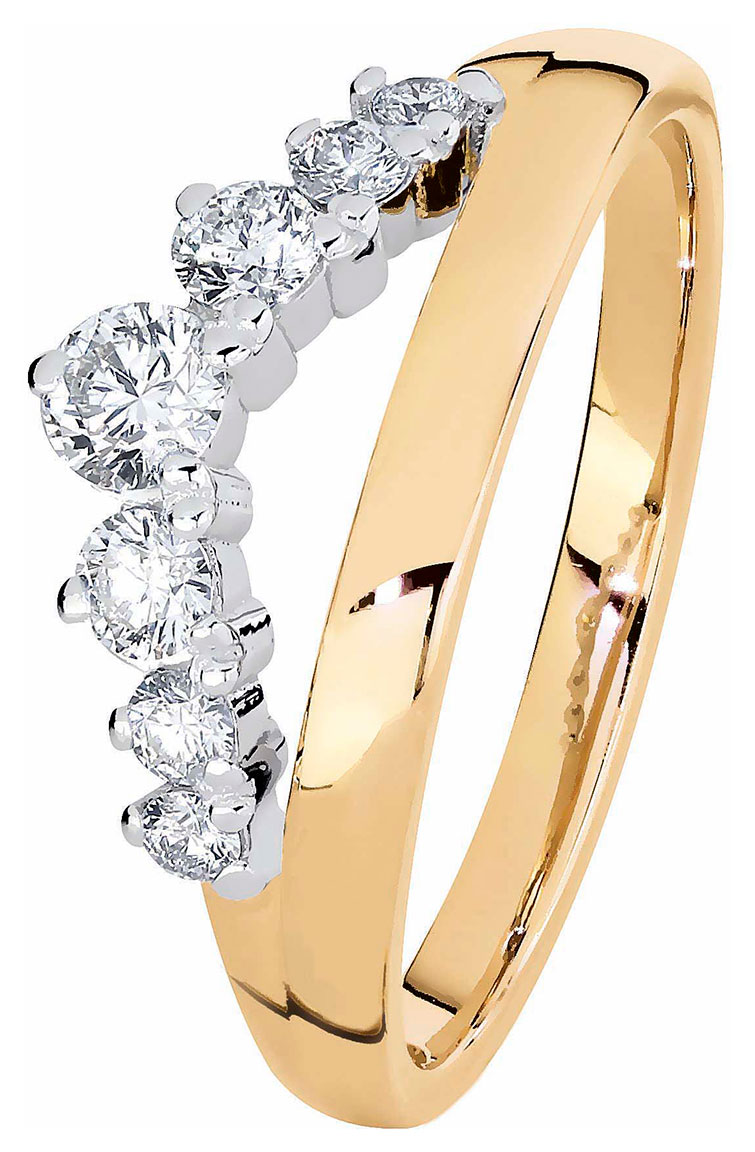 The Kohinoor 033-405-37 Tia chevron diamond ring has a small tiara shape and an open shank. This eye-catching diamond ring has a total of seven bright 0.37 carat diamonds. The ring is made of 14 karat yellow and white gold. The body width is 2.1 mm. Design Assi Arnimaa.