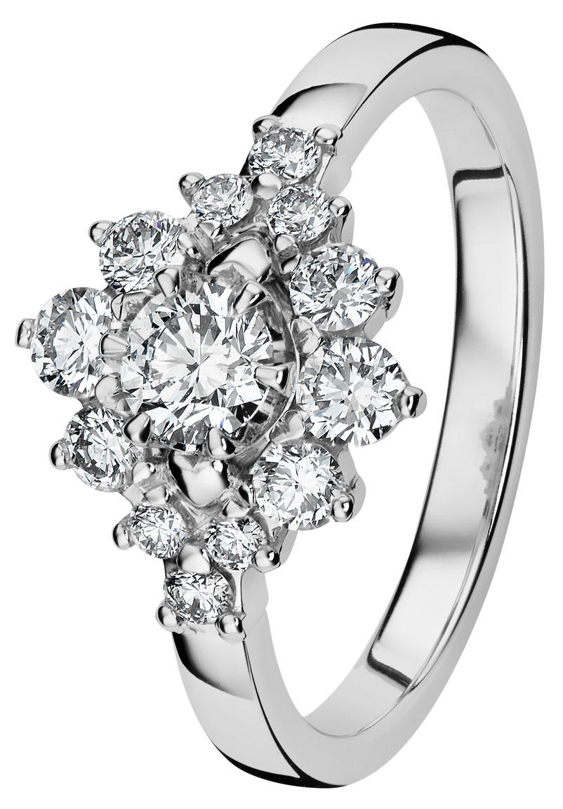 Kohinoor 933-100V-82B3 Josefina is a spectacular 14 karat white gold multi-stone ring. It is set with a total of 13 diamonds weighing 0.82 carats. The diamonds are cut into brilliant-cut diamonds and have a VS clarity rating. The ring has a 2.1 mm wide shank and is designed by Assi Arnimaa and made in Finland. Kohinoor rings are delivered in the manufacturer's original box and come with a one-year guarantee.