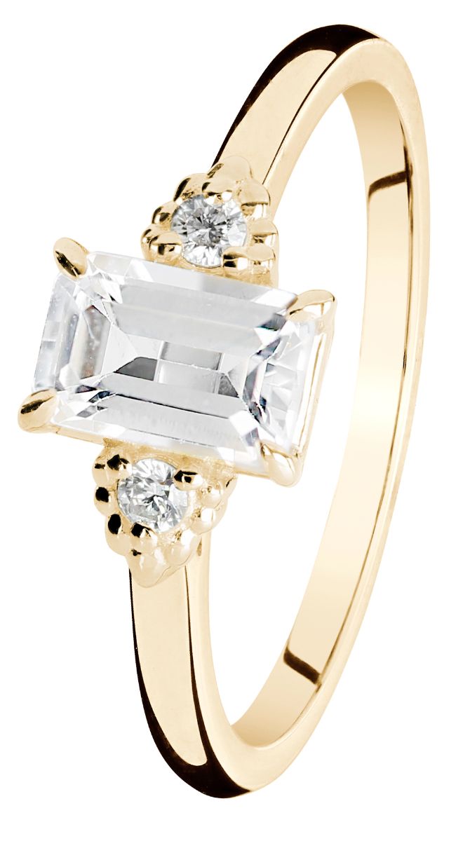 The Kohinoor Celeste 0.04 ct topaz diamond ring 033-441KT-04 is set with one white 6 x 4mm emerald-cut topaz and two brilliant-cut SI diamonds weighing 2 x 0.02 H SI. This delicate and delicate ring is made of 14 karat gold and measures 6.6 x 4.6 mm on the front and 1.55 mm on the back. Finnish Kohinoor rings are delivered in the original manufacturer's box and come with a 1-year guarantee.