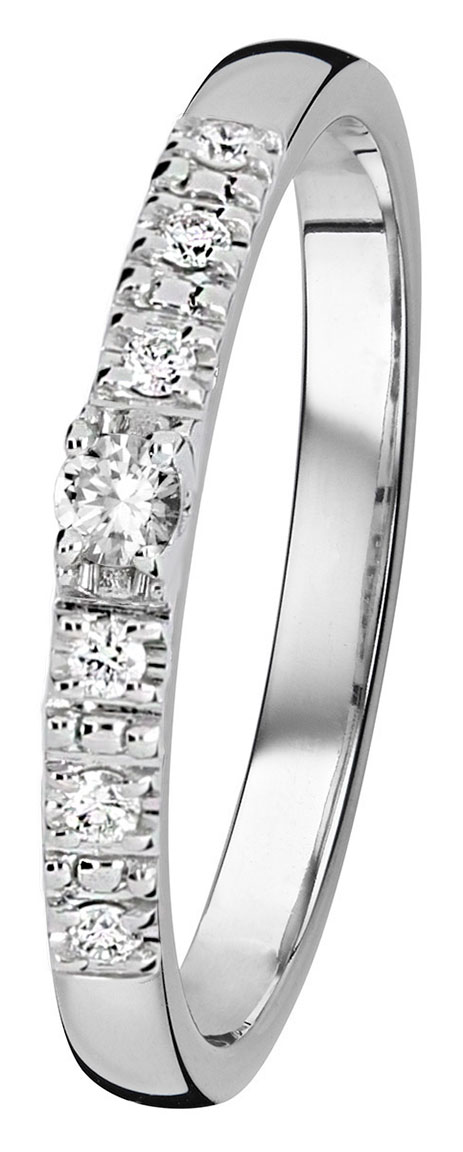 The Kohinoor Estelle 033-226V-10 is a beautiful 14 karat white gold semi-eternity diamond ring with side stones. The ring features 1 x 0,04 + 6 x 0,01 ct diamonds. The width of the ring is 2.2 mm. Kohinoor rings come in the original manufacturer's box and are guaranteed for one year.