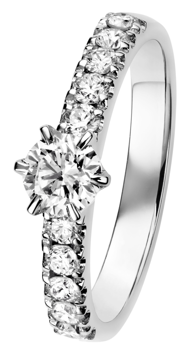 Kohinoor Leonora white gold diamond ring 934-248V-85B3 is a beautiful 18-karat white gold side stone ring. The ring features a crown-set centre stone and the side stones are channel set. The diamonds weigh a total of 0.85 carats (0.45 + 10 x 0.04). The diamonds are brilliant-cut and of VS clarity. The width of the ring is 2,7 mm and the width of the stone is 2,7 mm.