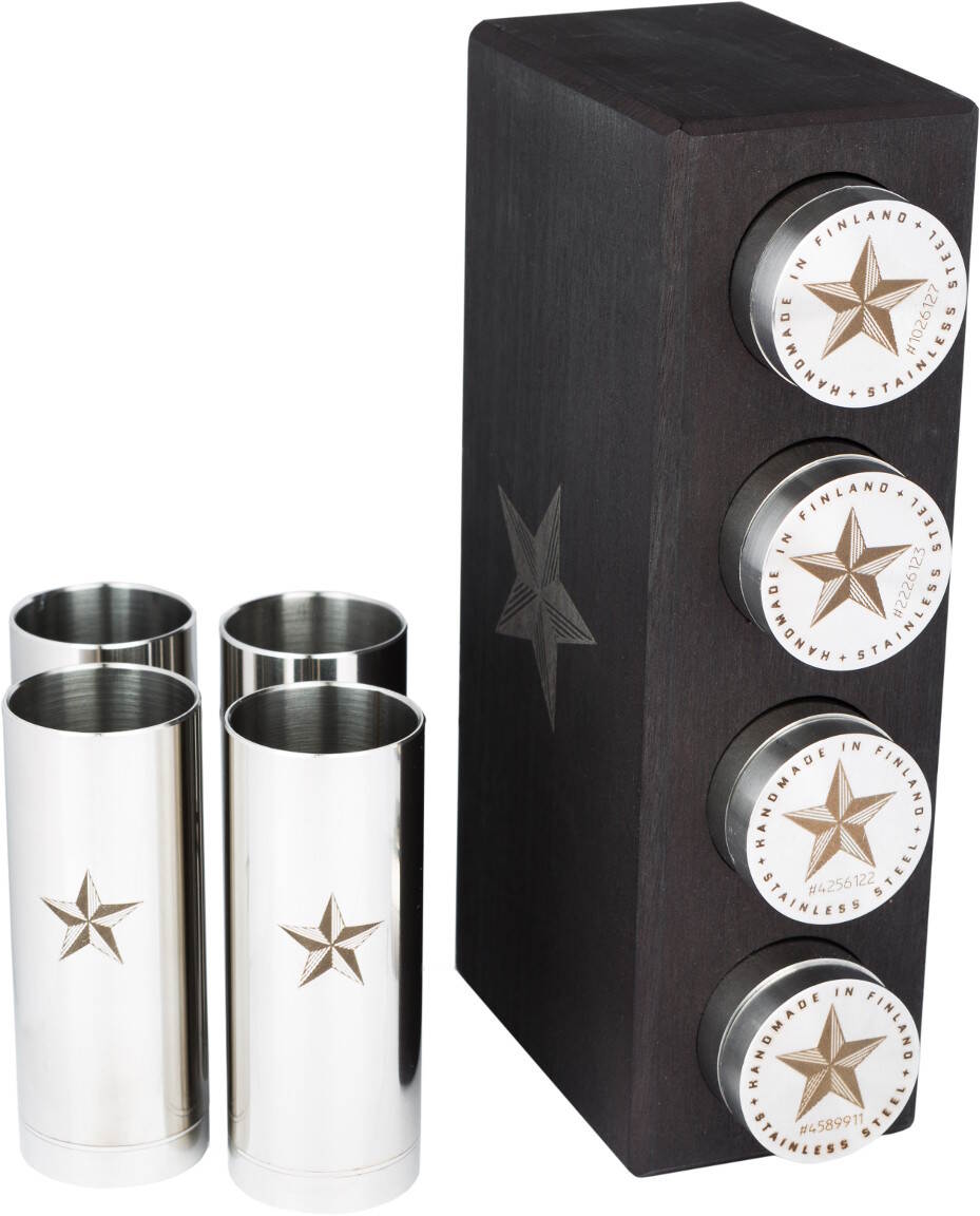Birch Ukko Schnapps Seriff 4 snaps glasses in a birch stand contains 4 pieces of Ukko Schnapps Seriff snaps glasses in a stylish dark brown birch stand. With these instruments, even the outlaw in the outpost doesn't have to spend time in the saloon dry. The snaps are made of mirror-polished mild steel and have a balanced base. The product is authentically handcrafted in South Ostrobothnia and adorned with a laser-marked sheriff's star. This makes it a great gift idea for fans of the "Finnish Wild West". The Koivu Ukko snaps glasses are machine washable and they are also official alcohol glasses with a capacity of 4cl. Koivu Ukko is manufactured by Laitala furniture factory in Jura.
