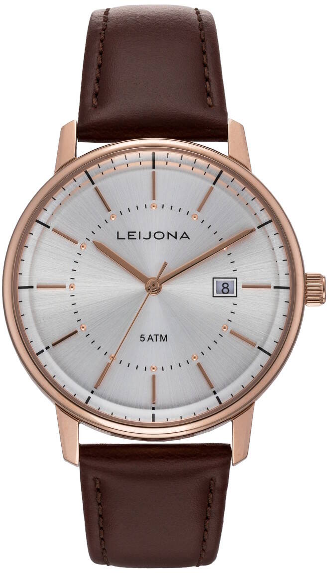 The Leijona 5020-2335 is a stylish and an elegant dress watch with a rose gold colored case and a brown leather strap. The watch face is protected by mineral glass. The watch body is 40mm wide and 10.7mm thick. The leather strap is 20mm wide where it attaches. Leijona watches come with a 2-year warranty and are delivered in the original manufacturer's packaging.