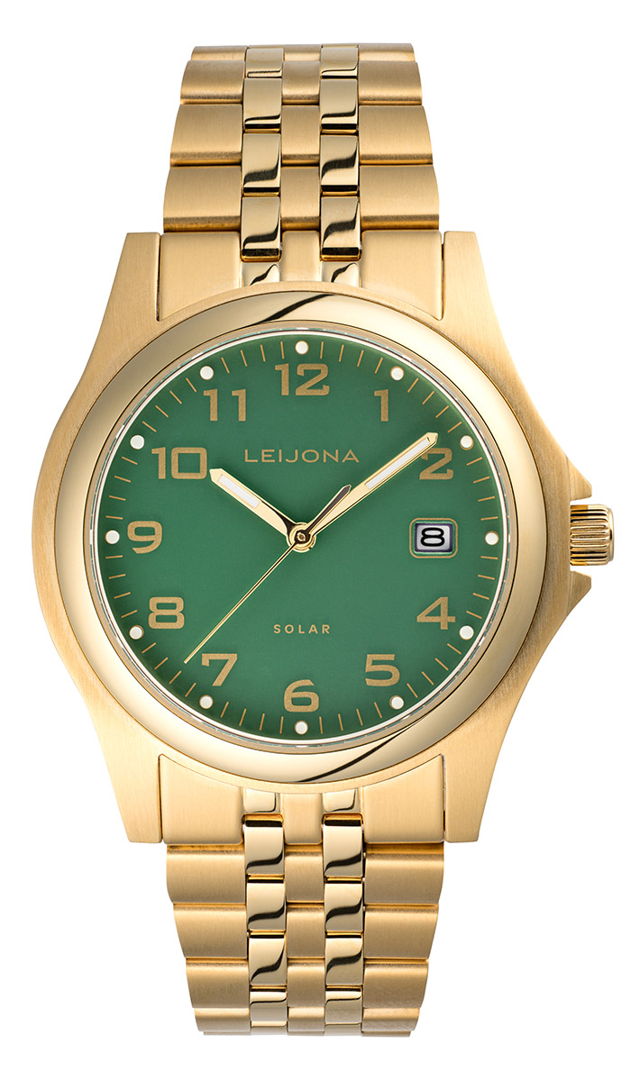 The watch features the AS32-3H solar engine, powered by sunlight. The gold-coloured case is made of stainless steel and measures 37.9 mm in diameter and 10 mm thick. Smooth and durable mineral glass protects the stylishly redesigned green dial with a date at 3 o'clock, large gold-coloured numerical indices and luminous hands to help you keep track of time in the dark. The completely redesigned steel bracelet, made of solid pieces, is 20 mm wide. The Lion 74 Solar KDBL Green 5010-2593 has a water resistance rating of 50m/5atm, meaning it has limited water resistance (swimming is not recommended).