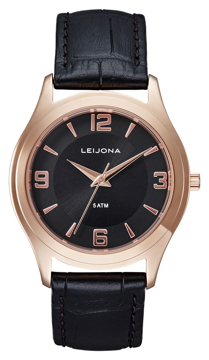 Leijona Colorful Ruska Black 5120-4651 is a stylish women's wrist watch. The 34 mm wide and 9 mm thick case is made of rose gold colored stainless steel. The watch is fitted with a black leatherette bracelet with a width of 18 mm at the attachment point. The black dial is protected by mineral glass. The water resistance rating of the Leijona 5120-4651 is 50m/5atm, which means that the watch has limited water resistance. Designed in Finland, Leijona watches come with a two-year warranty and are delivered in the manufacturer's original case.