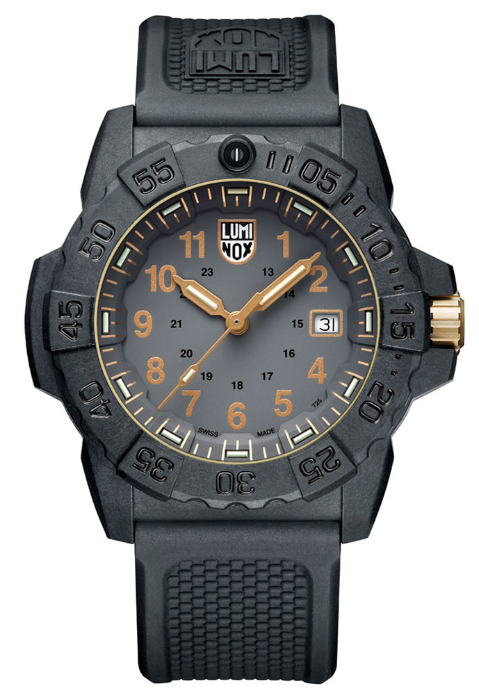 Luminox Navy SEAL 3508.GOLD is the perfect choice for anyone looking for durable outdoor watch. The watch is made in Switzerland, and in the familiar style of durable Navy SEAL watches, is made of CARBONOX™ material, which is 6 times lighter than steel, 3 times lighter than titanium, and is anti-magnetic. As the material does not contain steel, it is also suitable for sensitive skin and is hypoallergenic. The screwed back cover is made of 316L surgical steel. The durability is completed by a water resistance of 200 meters, a screw-locked crown, and a mineral glass protecting the dial. Its water resistance makes this watch ideal as a diving watch.