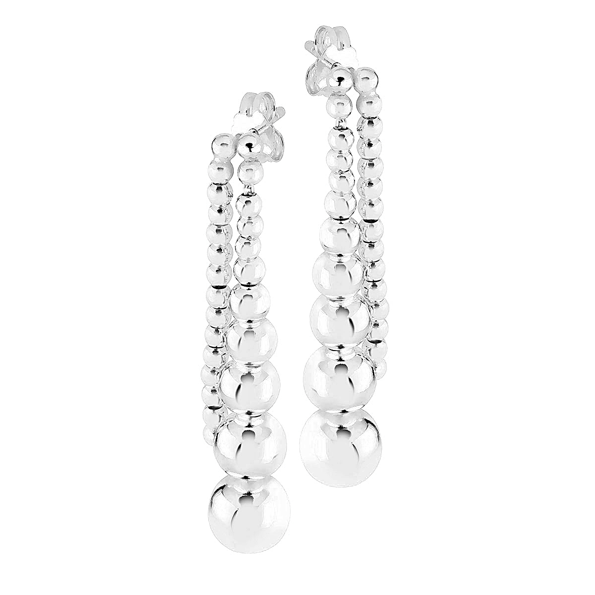 Gorgeous silver Lykka Casuals ball earrings are spectacular and vibrant as they swing from the ear. A row of downward-scaling silver balls and a thin chain next to them give the jewellery a rich yet airy look. The longer row of balls is 40mm long and the shorter 30mm. These are very versatile, perfect for everyday and special occasions. Made of rhodium-plated silver. The rhodium plating prevents the jewellery from darkening and helps keep the shine. Delivered in a Lykka box.