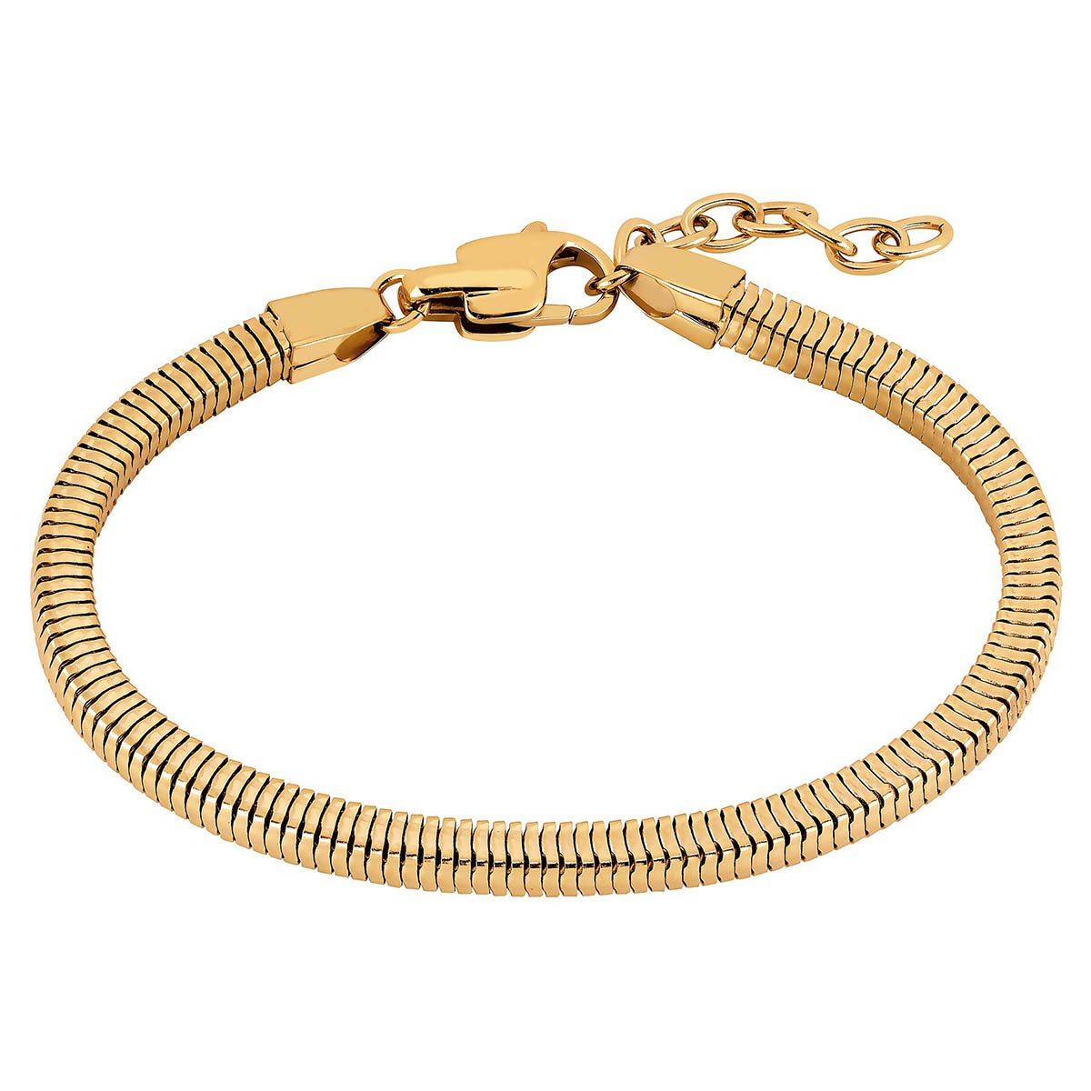 The Lykka Trend gold-colored steel bracelet is a stylish and modern snake chain bracelet made of high-quality and durable gold-colored stainless steel. The smooth and flexible snake chain model fits comfortably on the wrist and adds a sophisticated finish to the outfit.