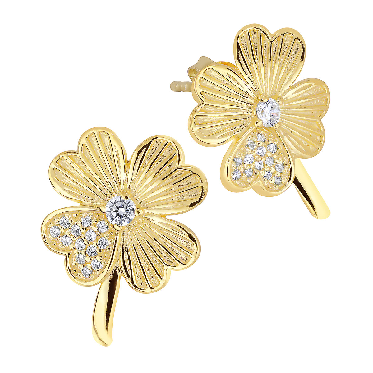 Lykka Symbols clover earrings add a touch of elegant luck to your style. The earrings are made of gold-plated silver and feature a four-leaf clover finished with sparkling zirconia stones that adorn one leaf and the center of the jewelry.