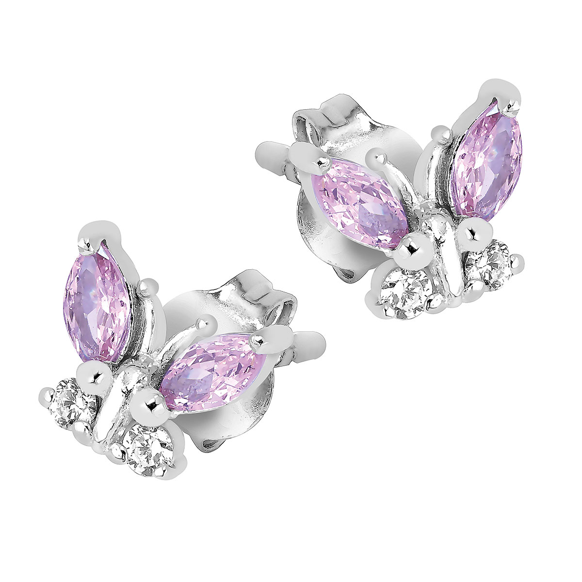 The cute Lykka Symbols butterfly-shaped stud earrings are made of high-quality rhodium-plated silver, which retains its beautiful shine and protects against tarnishing. Light pink and bright zirconia stones add vibrant color and elegant sparkle.