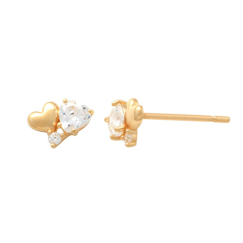 The delicate gold Lykken Casuals double heart earrings with zirconia are beautifully minimalist and versatile. The 9-karat gold stud earrings measure 4.8 x 6.3mm and feature two hearts - one gold and the other clear zirconia cut into a heart shape. You can combine these earrings with other earrings and they are perfect for everyday wear. Delivered in a Lykken box.