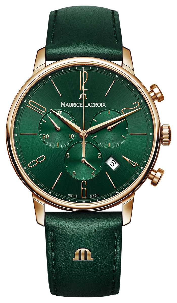 The Maurice Lacroix Eliros Chronograph EL1098-PVP01-620-5 is a stylish men's watch with a 40 mm wide gold-tone stainless steel case. The case is fitted with a green leather strap. A green dial with chronograph functions and a date display is protected by the sapphire crystal. The Maurice Lacroix EL1098-PVP01-620-5 is water resistant to 50m/5atm, which means it has limited water resistance (swimming is not recommended). Swiss made Maurice Lacroix watches are guaranteed for two years and are supplied in the original manufacturer's packaging.