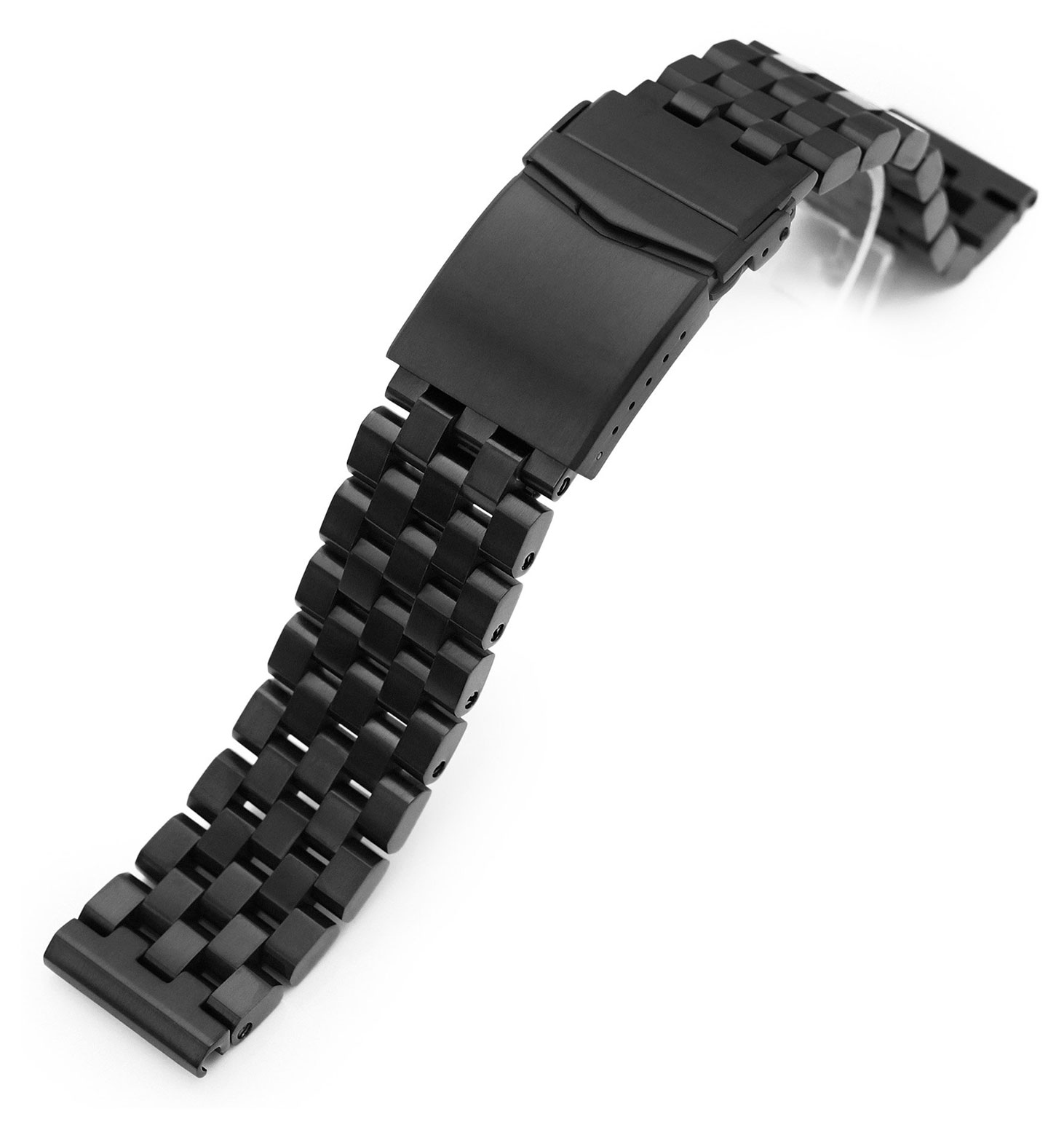 The MiLTAT Super Engineer II Straight End 22 mm SS222220BLC024 steel bracelet is a convenient way to update the look of your current watch.Made from 316L surgical steel, the bracelet fits all standard 22 mm lug spacing watches and the length is easily adjustable thanks to the six adjustment holes on the clasp. The surface of the bracelet is DLC coated. The bracelet is supplied with 2 pcs. 2.5 mm spring pins for secure attachment to the watch case. The width of the bracelet at the ends is 22 mm and the pieces of the bracelet are screw-fastened. The rigid locking system is completed by a double-locking turnbuckle.