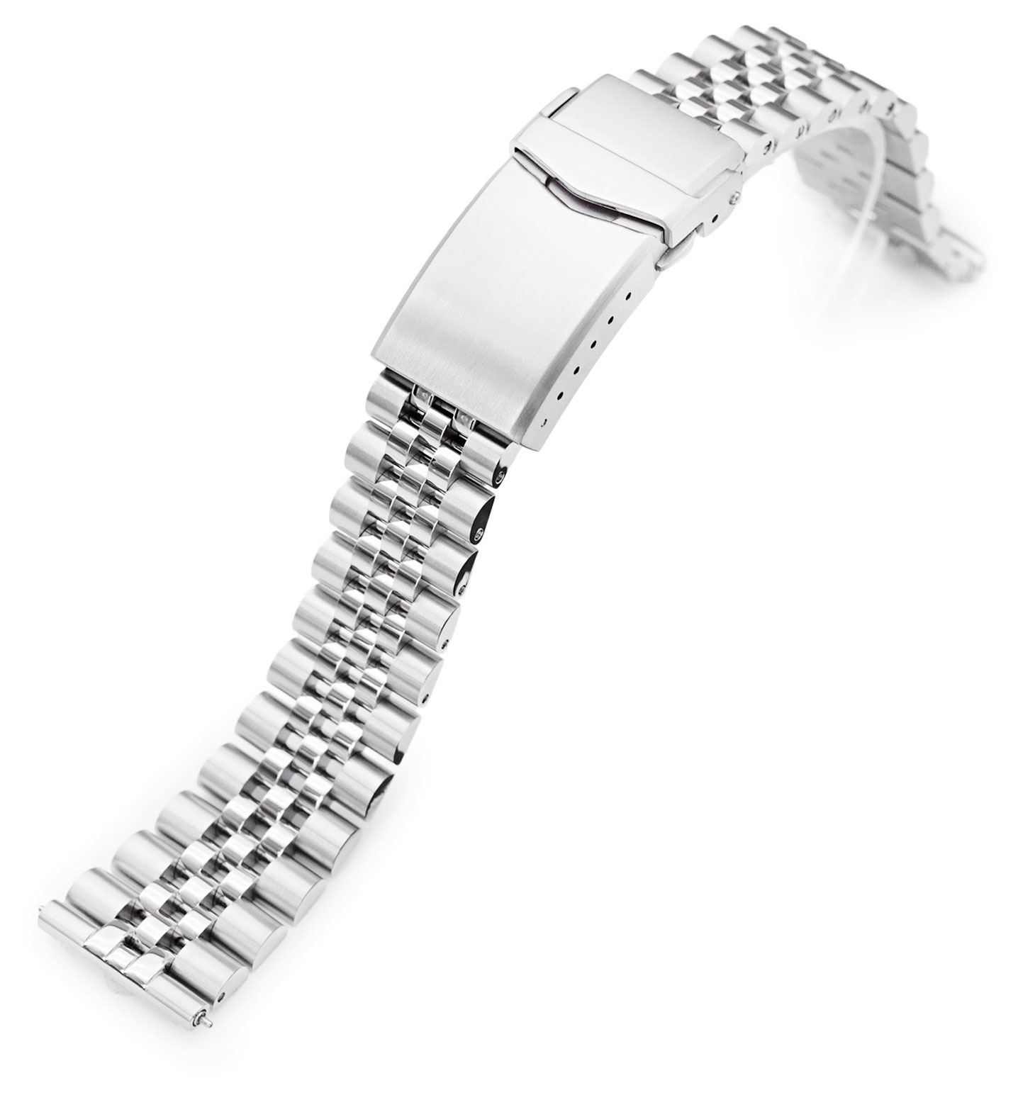 MiLTAT Super-JUB II Straight End20mm Quick Release steel bracelet SS201620B130S. This jubilee bracelet is a handy way to update the look of your current watch. Made from 316L surgical steel, the bracelet fits all 20mm lug spacing watches. The length of the bracelet is easily adjustable thanks to the six adjustment holes on the clasp. The bracelet is supplied with 2 pcs of 2,5 mm spring pins for secure attachment to the watch case. The width of the bracelet at the ends is 20 mm and the pieces of the bracelet are screw-fastened. The rigid locking system is completed by a double-locking turnbuckle.
