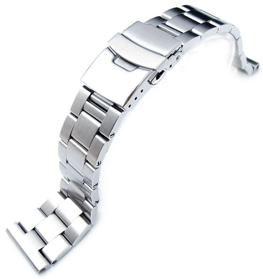 MiLTAT Super-O Boyer 19mm Straight End Steel Strap SS192003B023 is specially designed for sports and diving watches; it has a double-locking Flip-Lock diver's lock and its slim design blends easily into the wrist. The bracelet is made of 316L surgical steel, which makes the bracelet even more durable. The bracelet fits watches with a lug spacing of 19 mm, and the length is easy to adjust thanks to the adjustment holes in the lock (110 - 175 mm). The strap comes with 2 pcs 2.5 mm spring pins, which guarantee a safe attachment to the watch body. The width of the bracelet from the ends is 19 mm, and the pieces of the bracelet are screw-fastened.