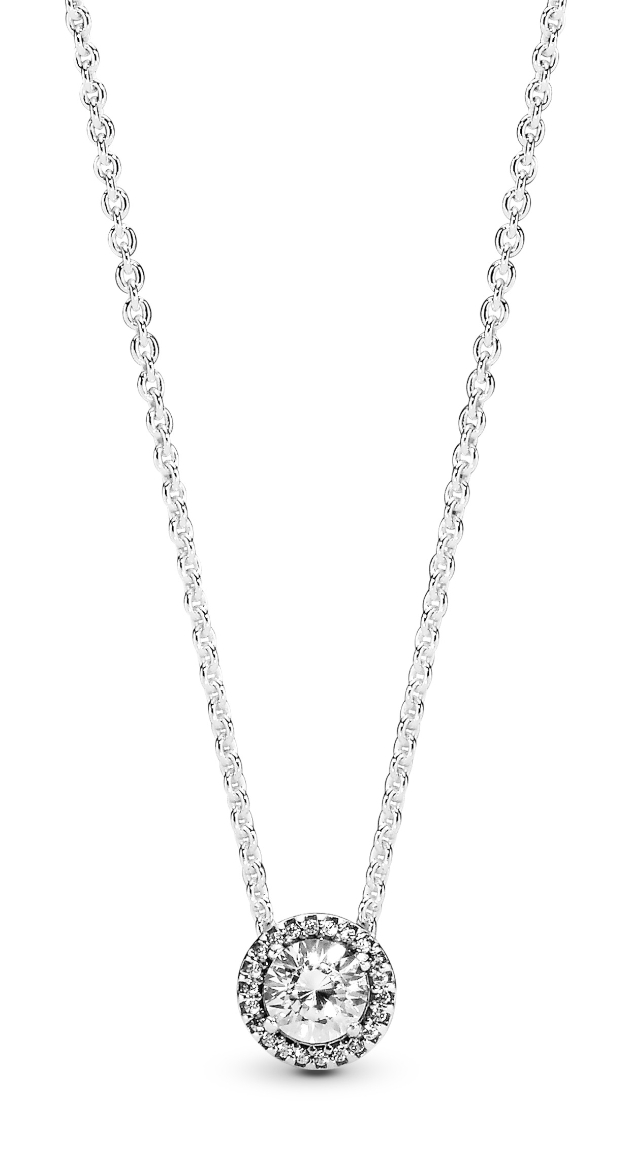 Pandora Classic Elegance necklace 396240CZ-45 is sterling silver, and has a beautiful halo pendant measuring 8,5 mm. The pendant is adorned with cubic zirconias. Pandora jewellery is delivered in the original manufacturer's box.