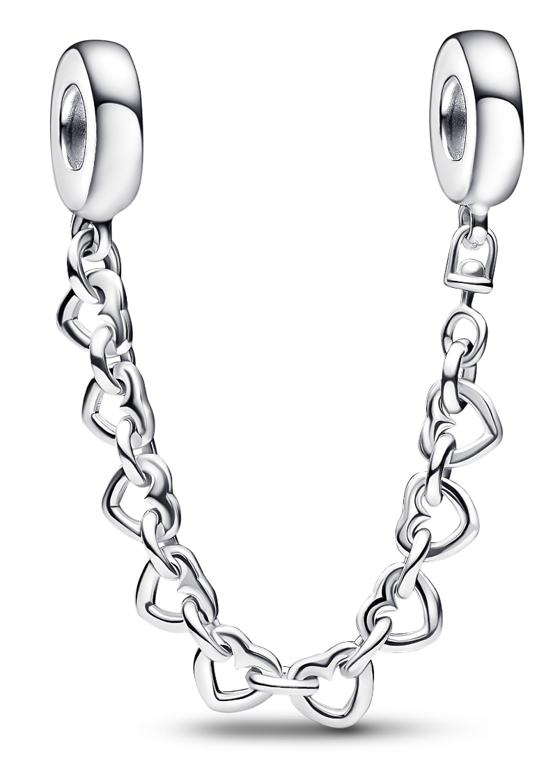 Pandora Linked Hearts Sterling silver security chain 792274C00-05 Keeps your Pandora jewellery always safe. This sterling silver piece is decorated with small hearts. The chain can be worn in two different ways. For example, it can be used to secure the bracelet in the hand when the clasp opens by placing it on either side of the clasp. In addition, the chain allows you to "tie" the charms together in beautiful formations. The length of the chain is 5 cm.