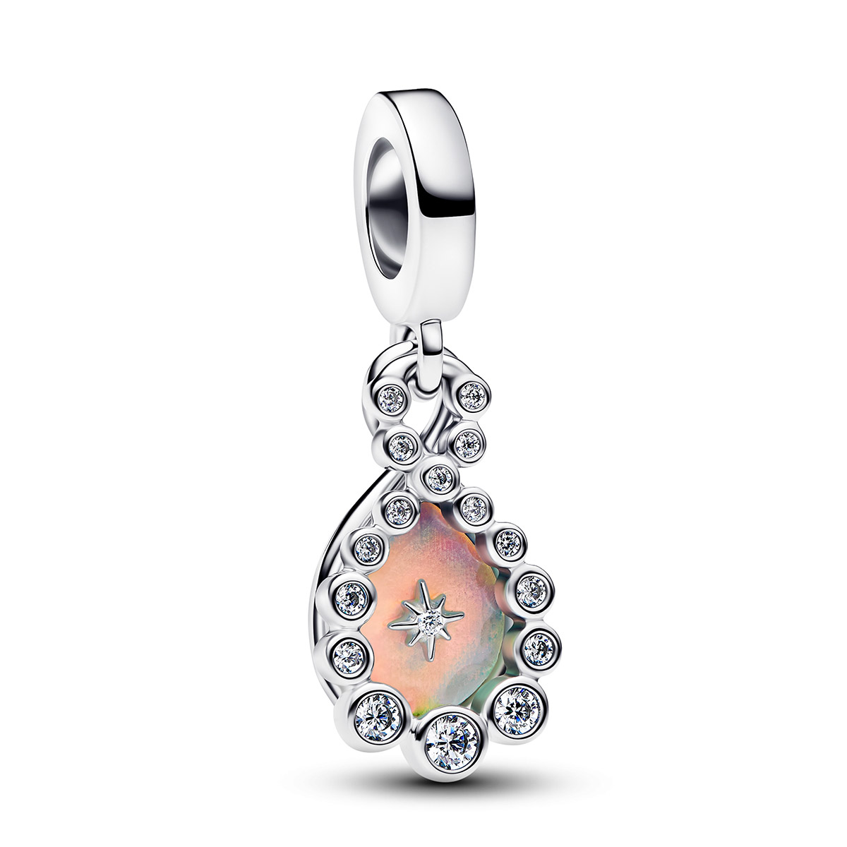 Add a touch of sophistication and natural glow to your jewelry with the Pandora Moments charm. The charm is threaded through the hole in the charm of your Pandora Moments necklace or bracelet. This stylish charm is made of sterling silver and features a multi-colored opal-tone stone surrounded by a frame of sparkling clear stones. The star pattern carved into the center of the stone symbolizes hope and light. The size of the charm is 13.9 x 8 mm.