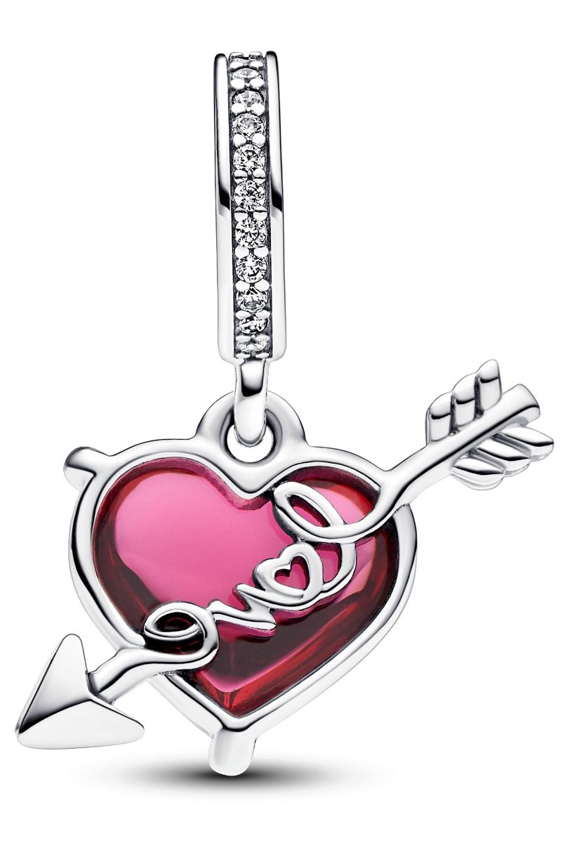 Carry love with you! Pandora Moments Red Heart & Arrow Murano Glass Dangle Charm Sterling silver charm 793085C01 with the text "love", love and genuine Italian Murano glass. This lovely pendant is the perfect gift for yourself or a loved one. Made of sterling silver, it is easy to combine with your own Pandora bracelet or necklace. Pandora jewellery comes in the original manufacturer's box.