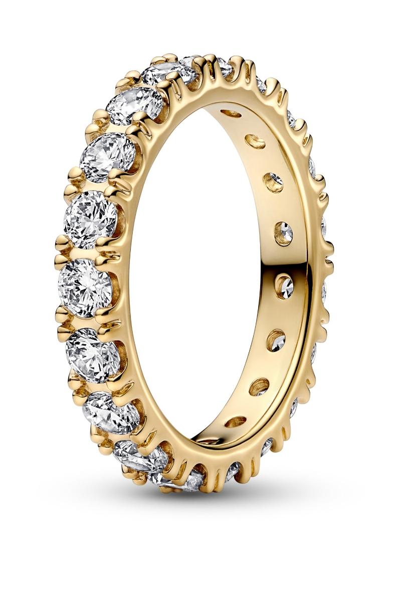 Pandora Sparkling Row Eternity ring 160050C01 is a classical Eternity ring in 14K yellow gold plated metal with white cubic zirconias. Carry the ring on your finger or connect it to another piece of jewelry in the Pandora collection! Width: 3.3.mm. Pandora eternity rings are shipped in a beautiful jewelry case.