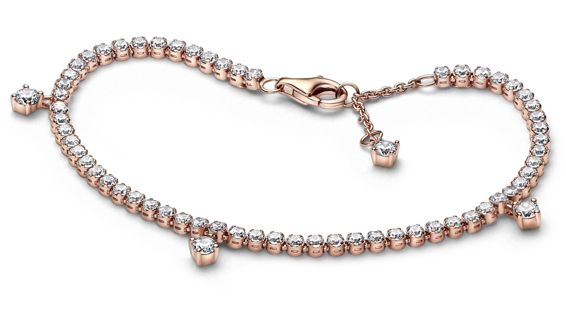Pandora Timeless Sparkling Drops Tennis Bracelet 582401C01 is a classic that makes a comeback year after year. This timeless jewellery design is adorned with brilliant-cut, synthetic cubic zirconia and is embellished with a series of separate pendants. Thanks to the adjustable chain, the length of the chain is adjustable and the model is available in several different lengths. The surface is finished in 14-karat rose gold. The Pandora jewellery comes in the original manufacturer's package.