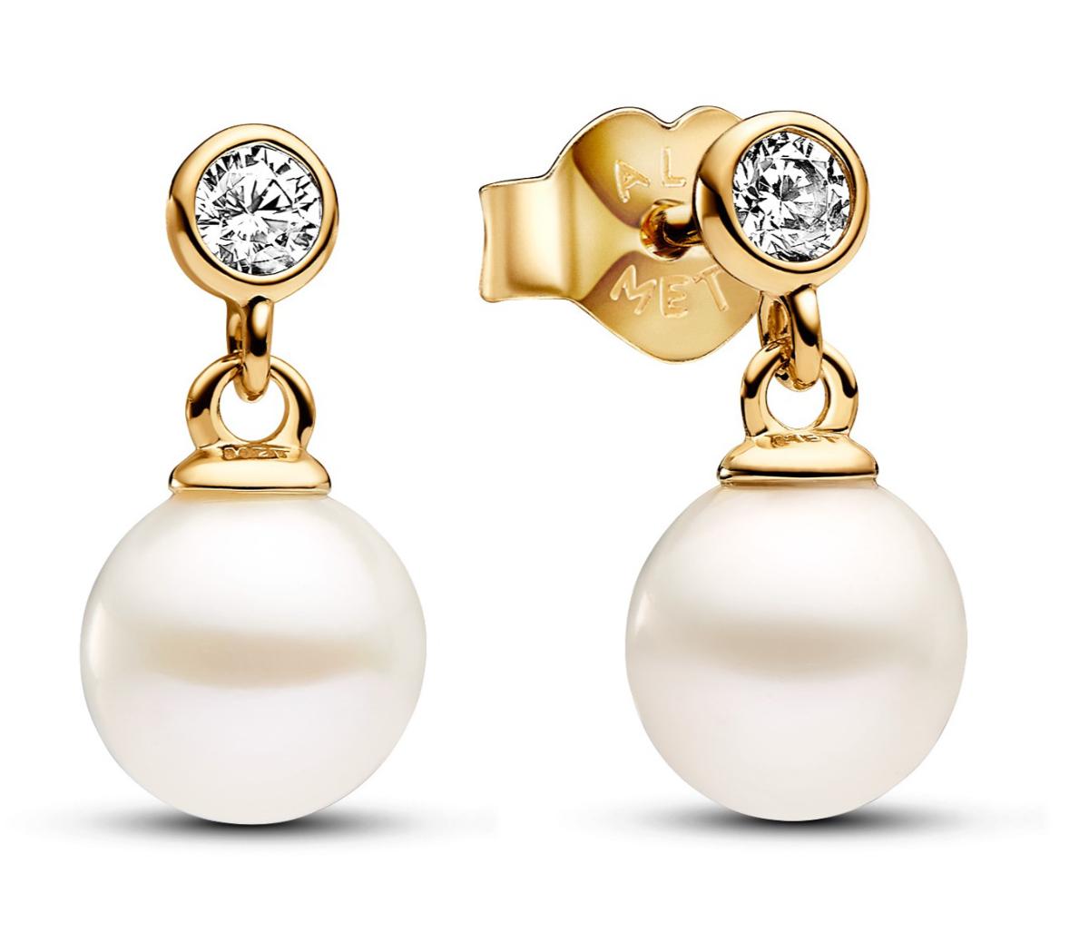 Pandora Timeless two-stone drop 14k gold-plated pearl earrings 263153C01 are finished in 14-karat yellow gold and adorned with genuine freshwater pearls and diamond-cut synthetic zirconia. A timeless classic perfect for any style, the earrings measure 12.8mm in size and the size of the pearl is 6.3mm. Pandora earrings are supplied in the manufacturer's original box.
