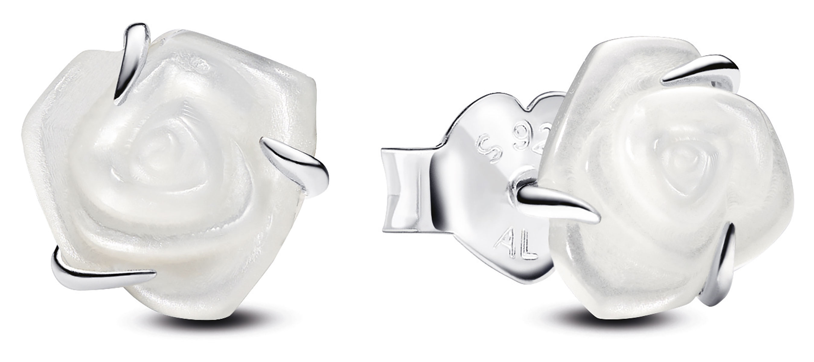 Pandora White Rose in Bloom earrings 293209C01 are made of sterling silver and decorated with synthetic bio-resin mother-of-pearl. These classic rose earrings have a stud pin, and measure 8 x 7,3 mm in size. Pandora jewellery comes in the original manufacturer's box.