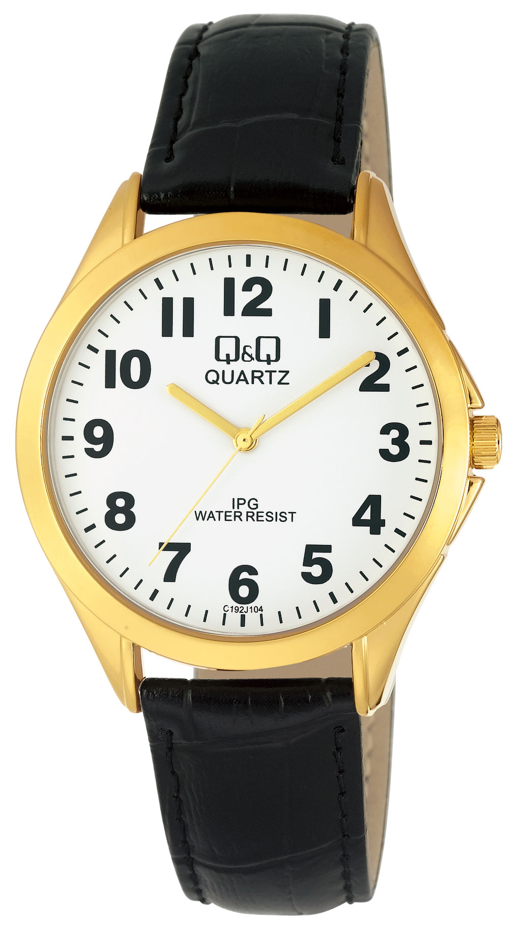 Q&Q C192J104Y is an understated, stylish men's wristwatch with a Miyota 2035 quartz movement, with a service life of approx. 3 years. The gold-colored body is combined with a black synthetic leather strap and a clear dial protected by mineral glass. The watch has a 38 mm wide and 9.2 mm thick metal frame. The bracelet is 220 mm long and 18 mm wide. The watch is splash-proof (30m / 3atm), so it is well suited for daily use in normal humidity conditions.