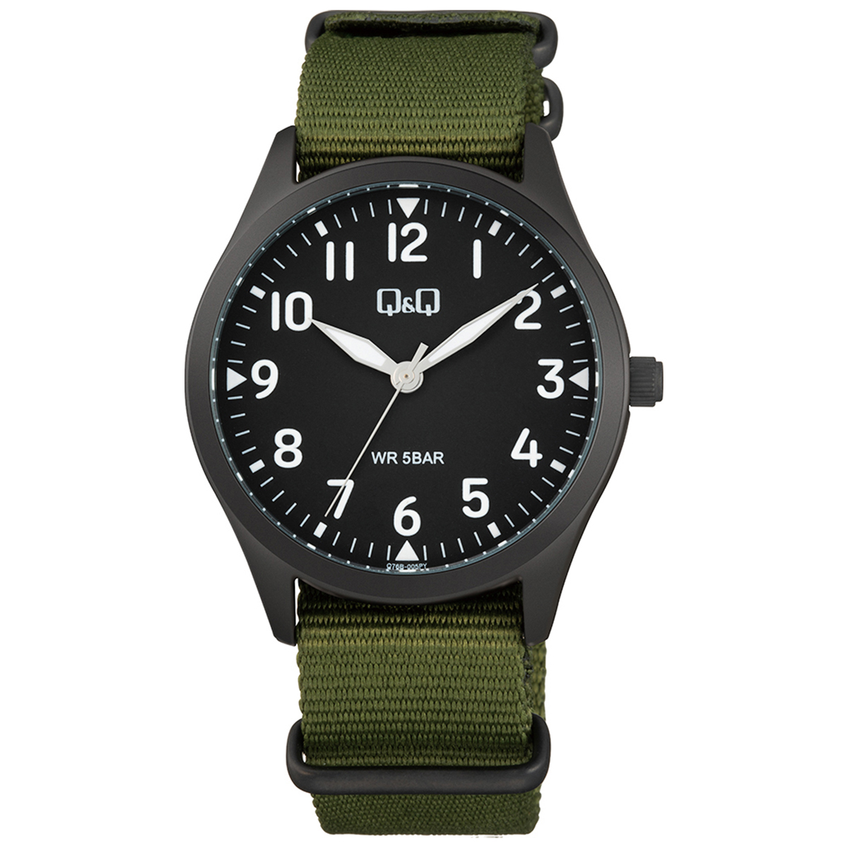 Q&Q Q76B-005PY is a military-inspired men's wristwatch that combines simplistic design with practicality. The watch's black, matte-finish 39 mm case and dark dial create a solid, tactical look, complemented by a military green nylon strap. The bracelet measures 190 mm in length and 20 mm in width. The dial features large, clear white numerals and hands for excellent legibility at a quick glance. The seconds hand stands out subtly in white, and the lightweight material of the bracelet makes the watch comfortable to wear every day.