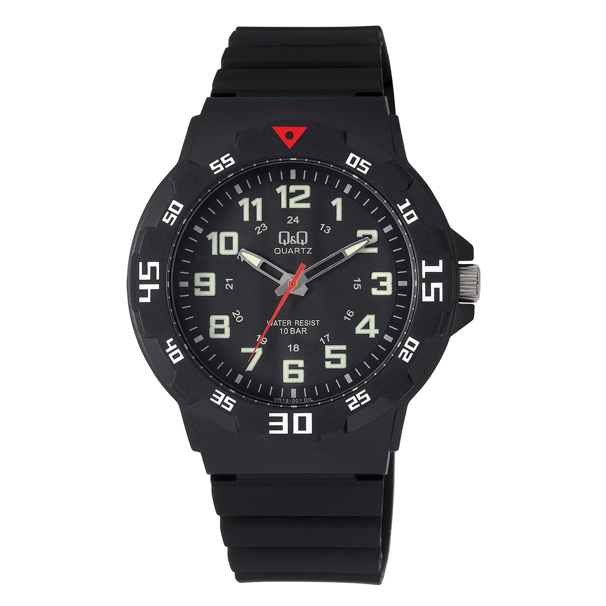 Q&Q VR18J001Y is a practical and sporty men's wristwatch with a 43 mm plastic body and a lightweight 20 mm wide and 215 mm long construction. The red second hand adds a dynamic contrast to the look. The 100m/10atm water resistance allows the watch to be used for swimming or water activities. A battery-powered quartz movement ensures accurate timekeeping, while acrylic glass protects the dial from everyday shocks.