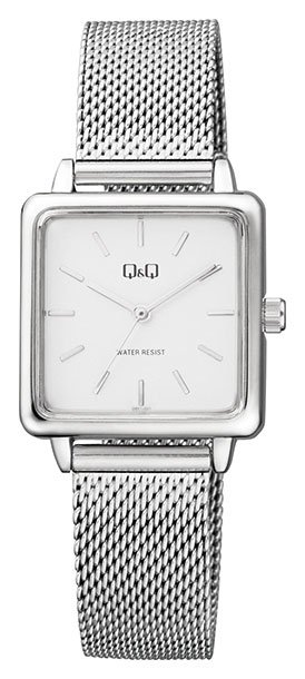 The Q&Q QB51J201N women's wristwatch features a battery-powered quartz movement and a modern square design. The white dial features silver-colored hands and indices and is protected by mineral glass. The watch case is made of durable metals and is 28 mm wide and 7.8 mm thick, making the watch very slim and lightweight. The thin metal bracelet is only 16 mm wide at the attachment point and 155–200 mm long. The QB51J201N wristwatch is water resistant to 30 m / 3 atm, meaning it is splash resistant.