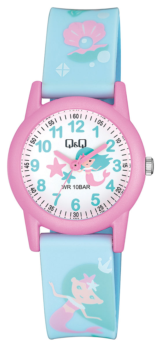 The Q&Q VR99J012Y children's watch has a lovely mermaid theme, with a light blue bracelet featuring a mermaid and a pearl-bearing seashell, a mermaid image and starfish on the face. The case of the watch is 30 mm wide and 10 mm thick. The clock has clear numerical indexes to help your child learn the dial easily. The total weight of the clock is 19 grams. The width of the plastic bracelet at the attachment point is 16 mm and the length is between 140 and 195 mm. The VR99J012Y is battery operated and is water resistant to 100m/10atm, making it suitable for surface diving and snorkelling.