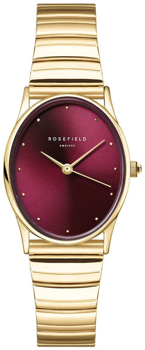 Rosefield Oval Burgundy Half-moon Steel Gold OVGSG-OV15 oval ladies' watch features a striking burgundy dial that harmonises beautifully with the gold-coloured bracelet. A mineral glass protects the dial, which features gold-coloured seconds, minutes and hour hands. The brass case measures 24 mm wide and 6.7 mm thick, while the 23k gold-plated steel bracelet measures 14 mm wide at the attachment point. The watch is splash-proof.