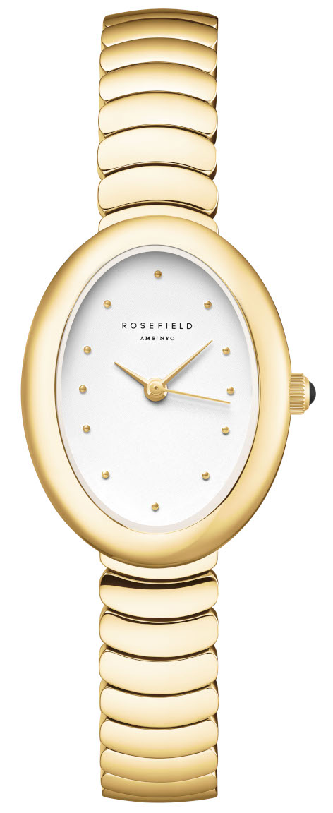 Rosefield Ovale OVWGSG-OV19 is a stylish women's wristwatch. The 22x29 mm gold-colored case is made of brass and its thickness is 7.7 mm. The gold-colored bracelet is made of stainless steel and its width from the attachment point is 10 mm. The watch is powered by a Japanese Miyota quartz movement. Under the mineral glass is a stylish white dial.