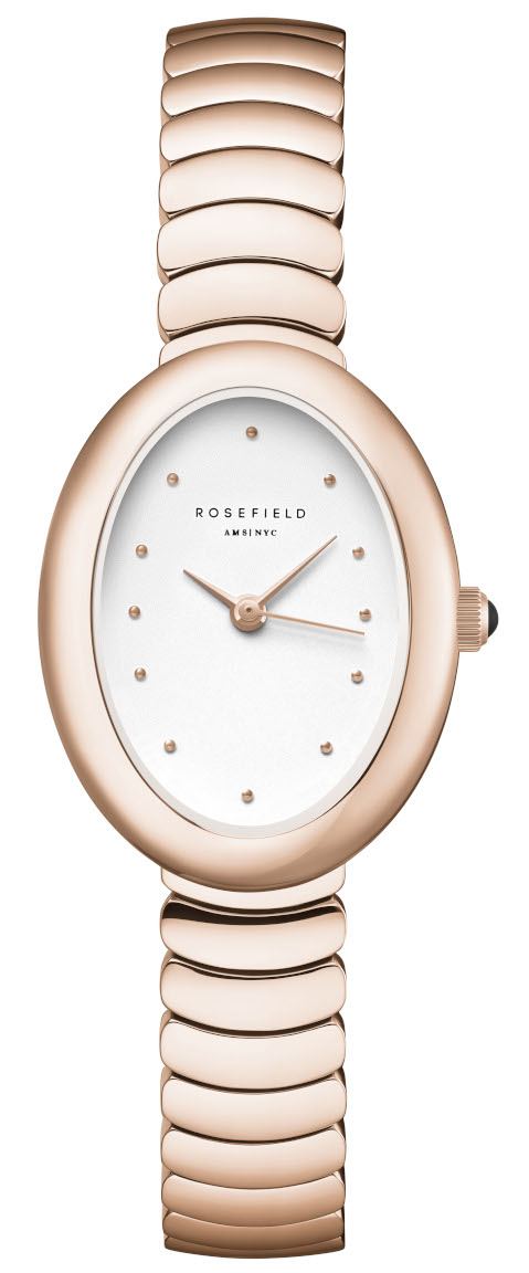 Rosefield Ovale OVWRSR-OV21 is a stylish women's wristwatch. The 22x29 mm rose gold-colored case is made of brass and its thickness is 7.7 mm. The rose gold-colored strap is made of stainless steel and its width from the attachment point is 10 mm. The watch is powered by a Japanese Miyota quartz movement. Under the mineral glass is a stylish white dial.