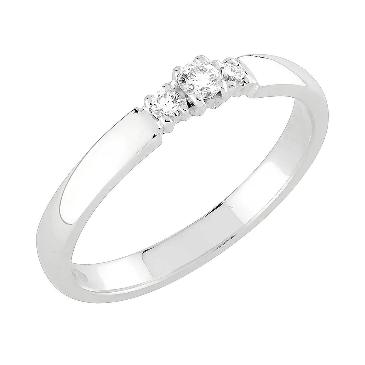 The three-stone Sandberg Aamukaste diamond ring V-28w is a graceful and elegant choice, even as a wedding or engagement ring. The barrel-shaped frame has a central diamond and two smaller edge diamonds in the center. The color of the diamonds is a rare colorless Top Wesselton and their weight is 0.09 ct. The material of the ring is 14 karat white gold. The width of the frame is approx. 2.3 mm. This ring sits beautifully next to various row rings.