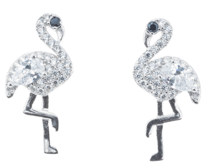 The Silver Bar pave 18 mm 8418 silver stud earrings feature a dancing black-eyed flamingo with a plumage made up entirely of several bright synthetic zirconia set in the surface. The jewel is 18 mm long and has a sturdy pin stud. The Silver Bar jewellery comes in the original manufacturer's packaging.