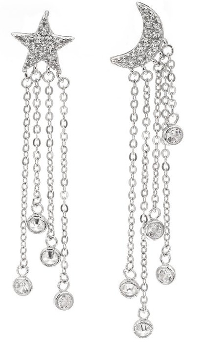 Silver Bar Moon and Star 8139 hanging tassel earrings are adorned with the moon and stars, and sparkling clear synthetic zirconia. The earrings are 50 mm long and have a pin stud at the back. The jewellery is made of silver. The Silver Bar earrings are supplied in the original manufacturer's packaging.