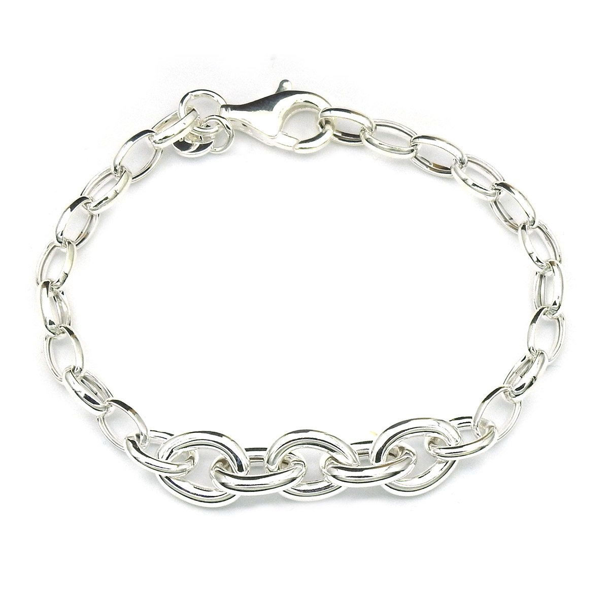 This bracelet of oval shapes flares out spectacularly in the middle. The bracelet is 19 cm long and 9.5 mm wide at the widest links. The bracelet has a large, impressive parrot clasp. It is made of silver.
